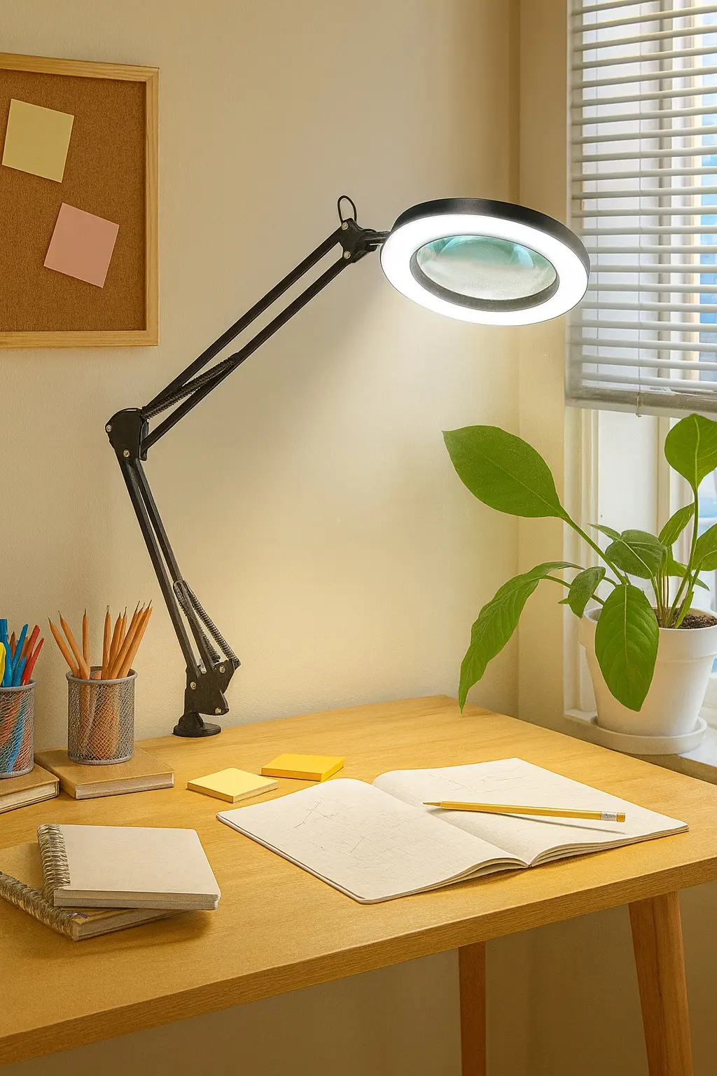 Lámpara de Escritorio con Lupa, Luz. Regulable y Conexión USB. Optimiza tu espacio de trabajo con esta lámpara de escritorio multifuncional, equipada con una lupa integrada ideal para tareas de precisión como lectura, manualidades o electrónica. Su luz LED ofrece varios tonos de intensidad (cálido, neutro y frío), ajustables según tu necesidad, para cuidar tu vista en todo momento. Gracias a su brazo flexible y conexión USB, puedes usarla fácilmente con tu computadora, power bank o adaptador de corriente.