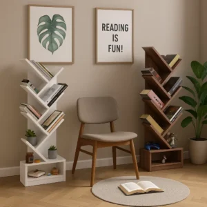 Este moderno librero vertical es perfecto para salas, recámaras u oficinas. Su diseño entrecruzado no solo le da un toque original y contemporáneo, sino que también permite organizar tus libros, plantas o artículos decorativos de forma práctica y elegante.